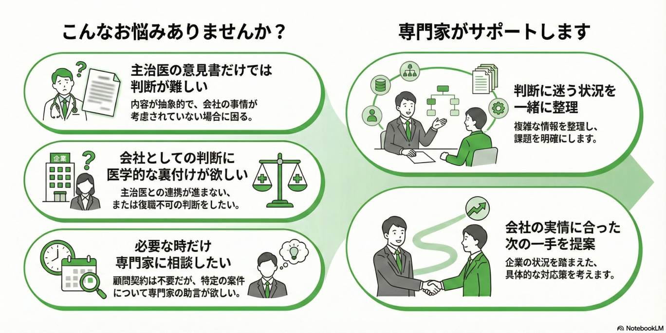 メンタルヘルス不調者対応、復職判断、主治医との連携など、状況に応じた対応についてご相談いただけます。