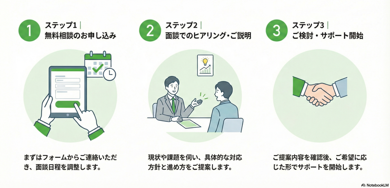 内容をご確認いただいたうえで、ご希望に応じた形でサポートを開始します。